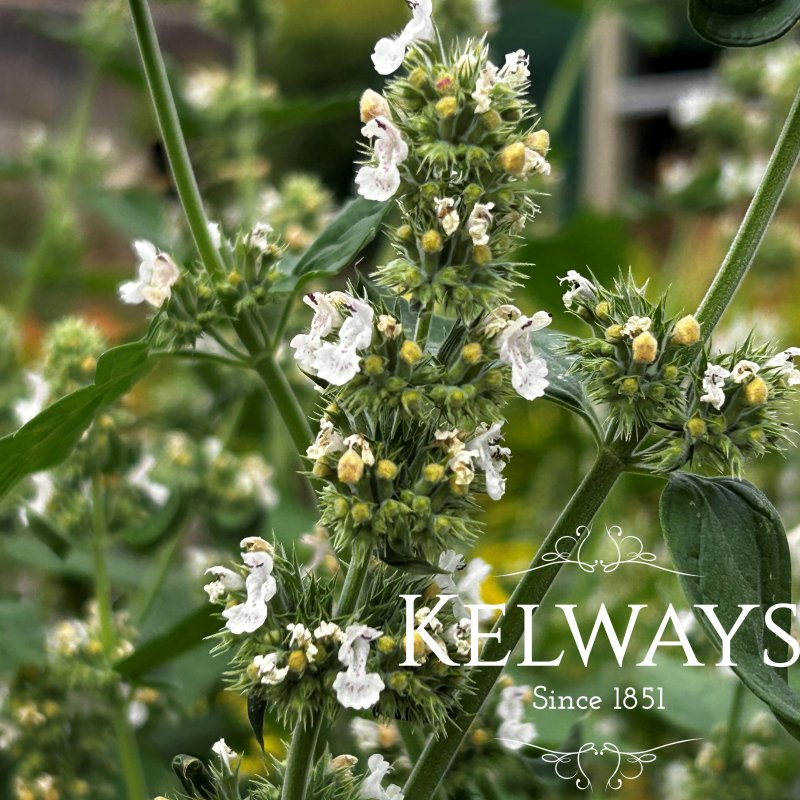 A deciduous perennial with aromatic, greyish-green leaves with toothed margins, producing small white flowers spotted with violet in summer and autumn.